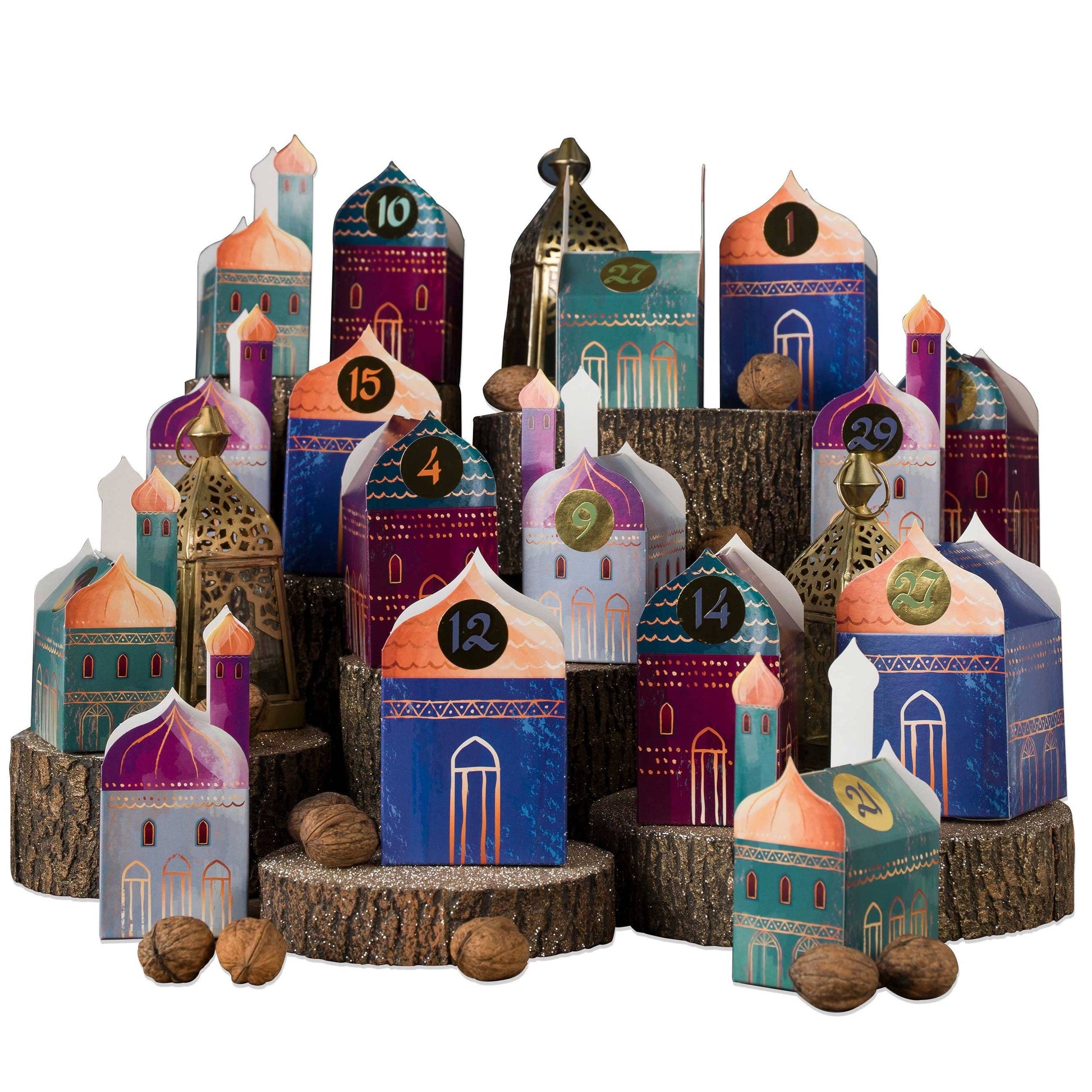 Produktname: Papierdrachen DIY Ramadan Kalender zum Basteln und Befüllen - Häuser Set - 30 bunte Falt-Schachteln zum Aufstellen und Dekorieren - 24 Boxen - Ramadandorf - Eid Mubarak - wiederverwendbar - Set 1